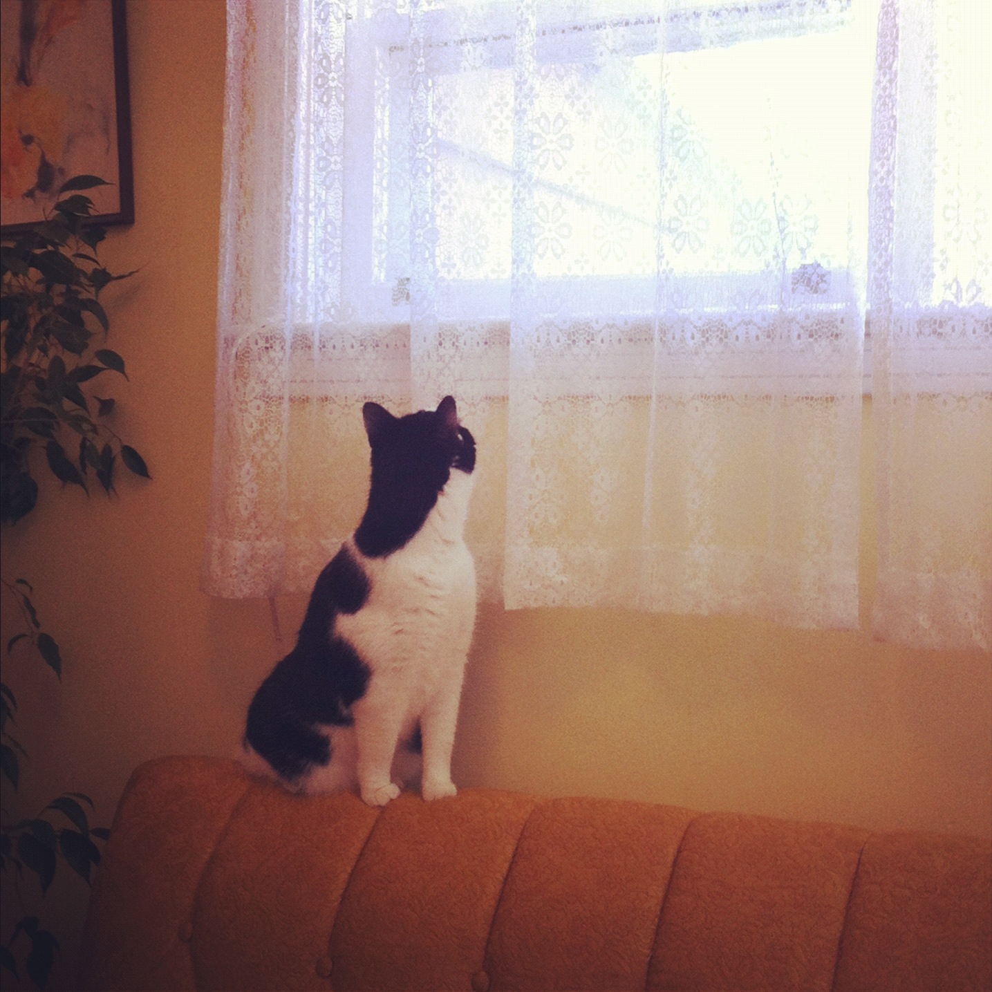 Solly is consumed by squirrel activity in the lilac outside the window |